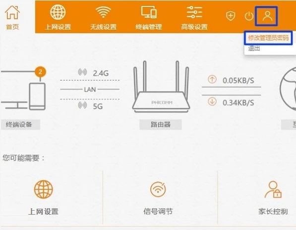 如果你的路由器开启了2.4G和5G这里建议您把不同的无线设置成不同的密码;那么使用什么无线WiFi密码比较安全呢这里建议大家使用字母以及数字还有符号的组合并且大于八位数。 如果你还需要修改管理员密码的话点击右上方的一个管理员图标;然后一次打开修改管理员密码;并在修改管理员密码输入框中重新输入你的管理员密码。